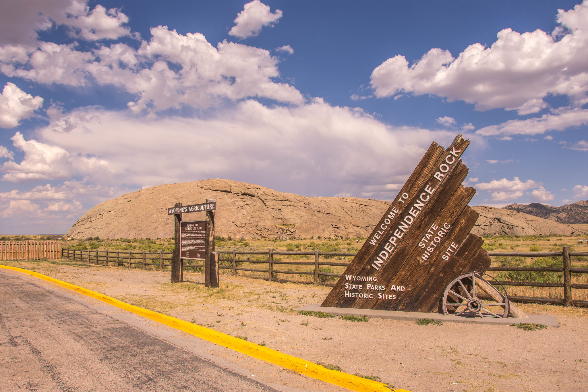 Independence Rock is a large granite rock, approximately 130 feet (40 m) high, 1,900 feet (580 m) long, and 850 feet (260 m) wide, which is in southwestern Natrona County, Wyoming along Wyoming Highway 220. During the middle of the 19th century, it formed a prominent and well-known landmark on the Oregon, Mormon, and California emigrant trails. Many of these emigrants carved their names on it, and it was described by early missionary and explorer Father Pierre-Jean De Smet in 1840 as the Register of the Desert.The site was designated a National Historic Landmark on January 20, 1961 and is now part of Independence Rock State Historic Site, owned and operated by the state of Wyoming.
